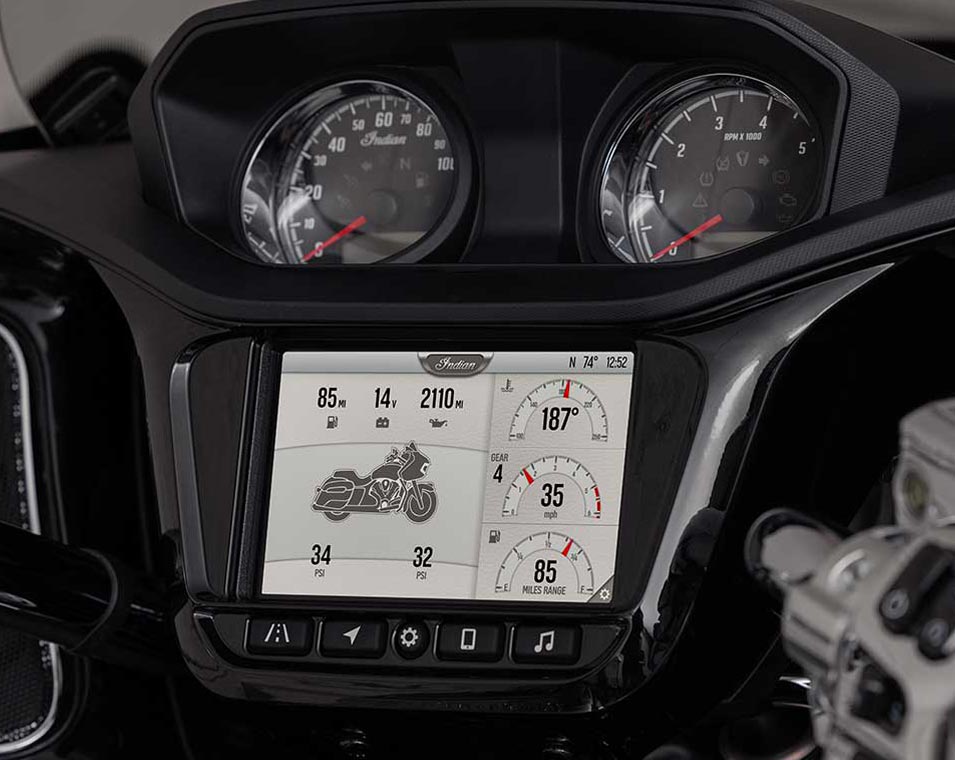 | Infotainment | 7-Zoll-Touchscreen mit RIDE COMMAND: Echtzeituhr; Umgebungslufttemperatur; Audio-Informationen; Karte/Navigation; Bluetooth-Status für Telefon und Headset; Fahrzeugstatus (Reifendruck, Spannung, Betriebsstunden, Ölwechsel); Fahrzeuginformationen (Geschwindigkeit, Kraftstoffverbrauch, Drehzahl, Ganganzeige); aktuelle Fahrdaten (Entfernung, Fahr-/Pausenzeit, Höhe, Höhenänderung); Tageskilometerzähler; Auswahl des Fahrmodus; Bildschirmhelligkeit; Anzeige von Fahrzeugfehlercodes; Apple CarPlay-Integration. |