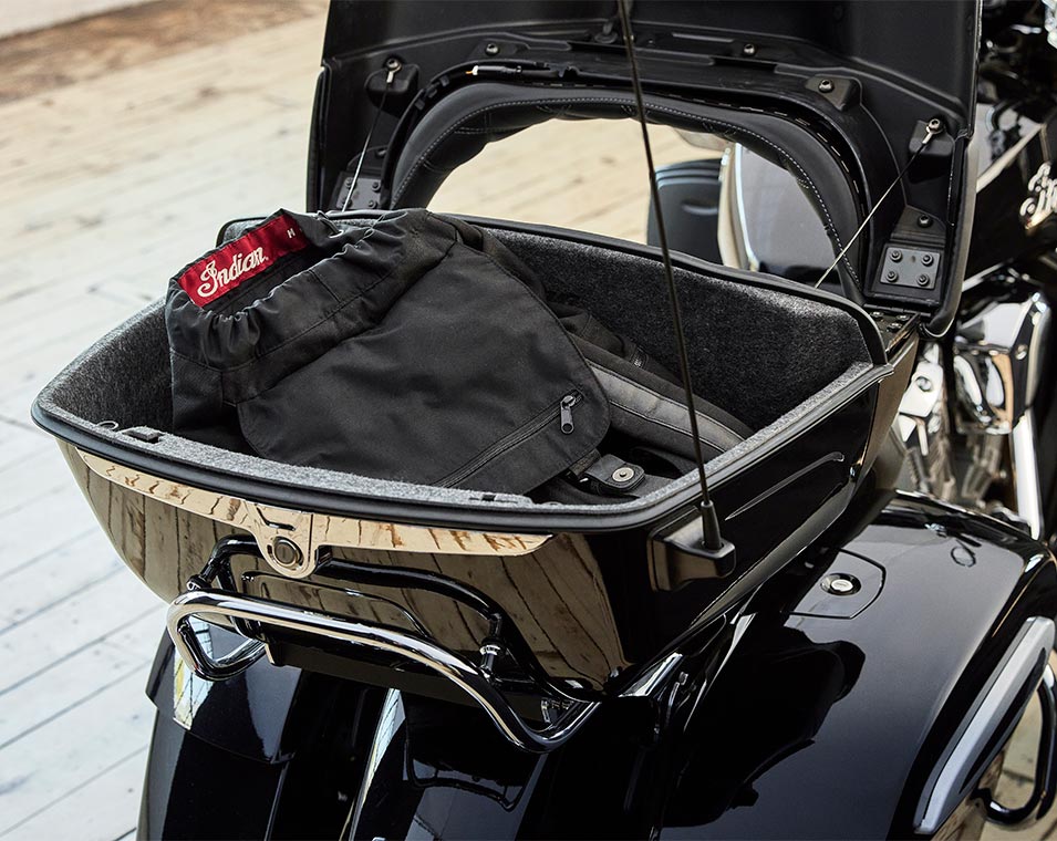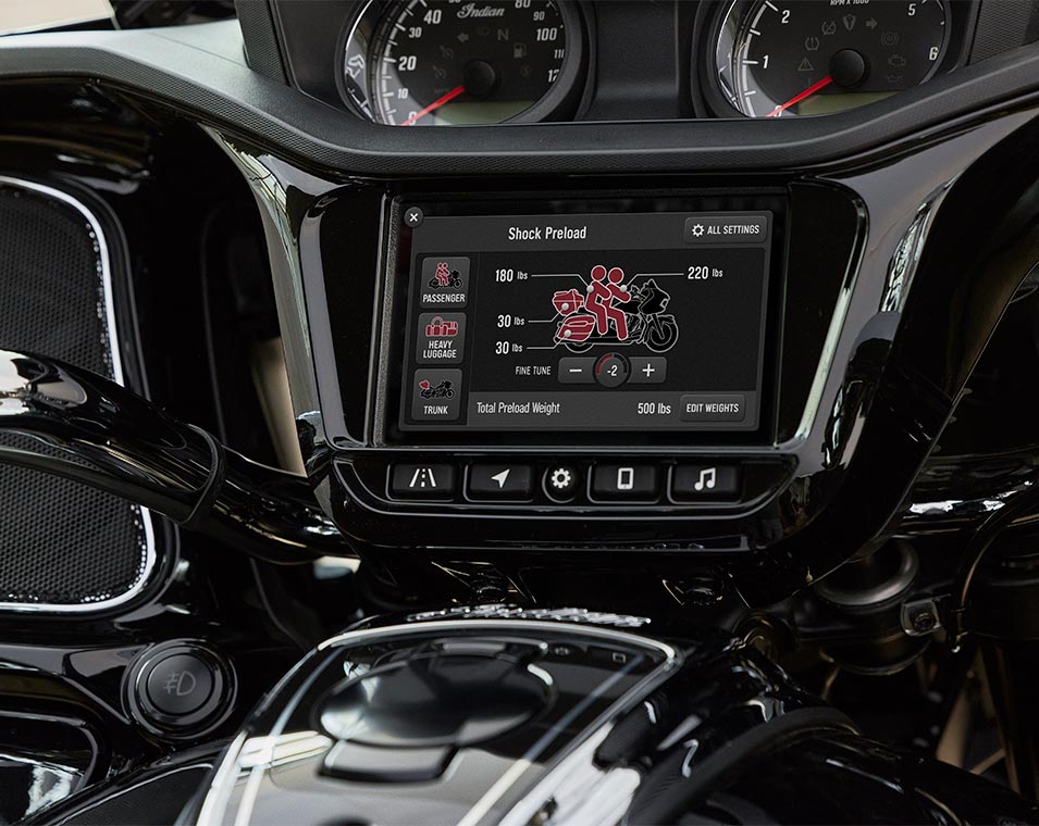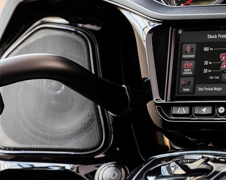 | SERIENAUSSTATTUNG | Smart Lean Technologie; Elektronisch einstellbare Stoßdämpfer-Vorspannung; Sitzheizung; Integriertes Fahrlicht in der unteren Verkleidung; Stauraum in der unteren Verkleidung; 7-Zoll-Touchscreen mit Ride Command inkl. Apple CarPlay-Integration; Wählbare Fahrmodi; Deaktivierung des hinteren Zylinders; Tempomat; Reifendrucküberwachung; Fernverriegelbare Satteltaschen und Topcase; über 136 l Stauraum; Highway-Bars; verstellbare Soziusfußrasten; Brembo-Bremsen; ABS; schlüssellose Zündung; rahmenfeste Verkleidung; elektrische Windschutzscheibe; verstellbare Lüftungsschlitze in der Verkleidung; beheizbare Griffe; 200-Watt-Audiosystem mit AM/FM, Bluetooth, USB, Smartphone-kompatiblem Eingang; 12-V-Ladeanschluss |