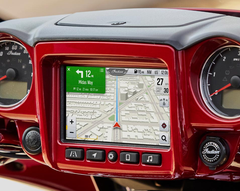 | Infotainment | 7-Zoll-Touchscreen mit RIDE COMMAND: Echtzeituhr; Umgebungslufttemperatur; Audio-Informationen; Bluetooth-Status für Telefon und Headset; Fahrzeugstatus (Reifendruck, Spannung, Betriebsstunden, Ölwechsel); Fahrzeuginformationen (Geschwindigkeit, Kraftstoffverbrauch, Drehzahl, Ganganzeige); aktuelle Fahrdaten (Entfernung, Fahr-/Pausenzeit, Höhe, Höhenänderung); Tageskilometerzähler; Auswahl des Fahrmodus; Bildschirmhelligkeit; Anzeige von Fahrzeugfehlercodes; Apple CarPlay-Integration. |